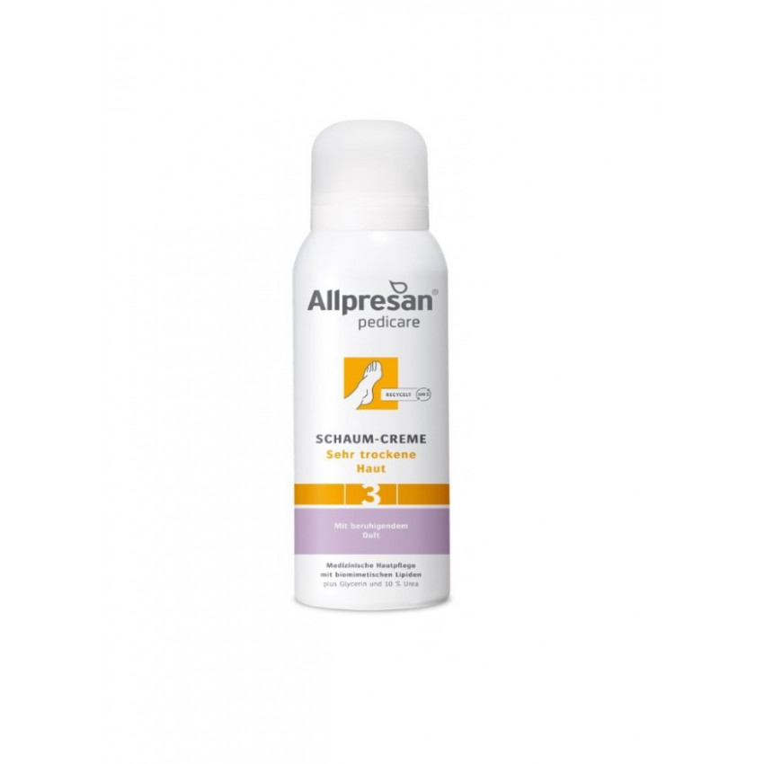 Allpresan zladila jemnú textúru krémovej peny radu č. 3 s upokojujúcou vôňou, ktorá pohladí vaše zmysly. Krémová pena svojim jedinečným zložením pokožku nôh vyhladzuje a podporuje jej prirodzenú ochrannú funkciu a zabraňuje ďalšiemu poškodzovaniu. Pokožku intenzívne hydratuje a zanecháva ju pružnú a hebkú.