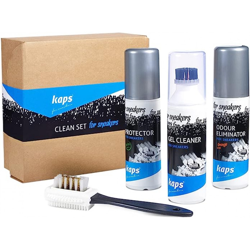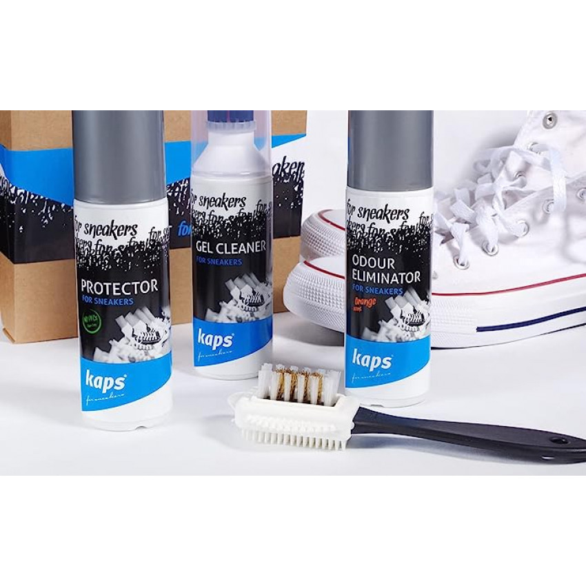 Kompletná súprava pre čistenie a starostlivosť o vaše športové obuv. Obsahuje Sneakers Gel Cleaner 100 ml na čistenie, Sneakers Protector 100 ml na ochranu pred vlhkosťou a nečistotami, Sneakers Odour Eliminator 100 ml - deodorant do tenisiek a kartáčik s nylónovým a mosadzným vlasom.
