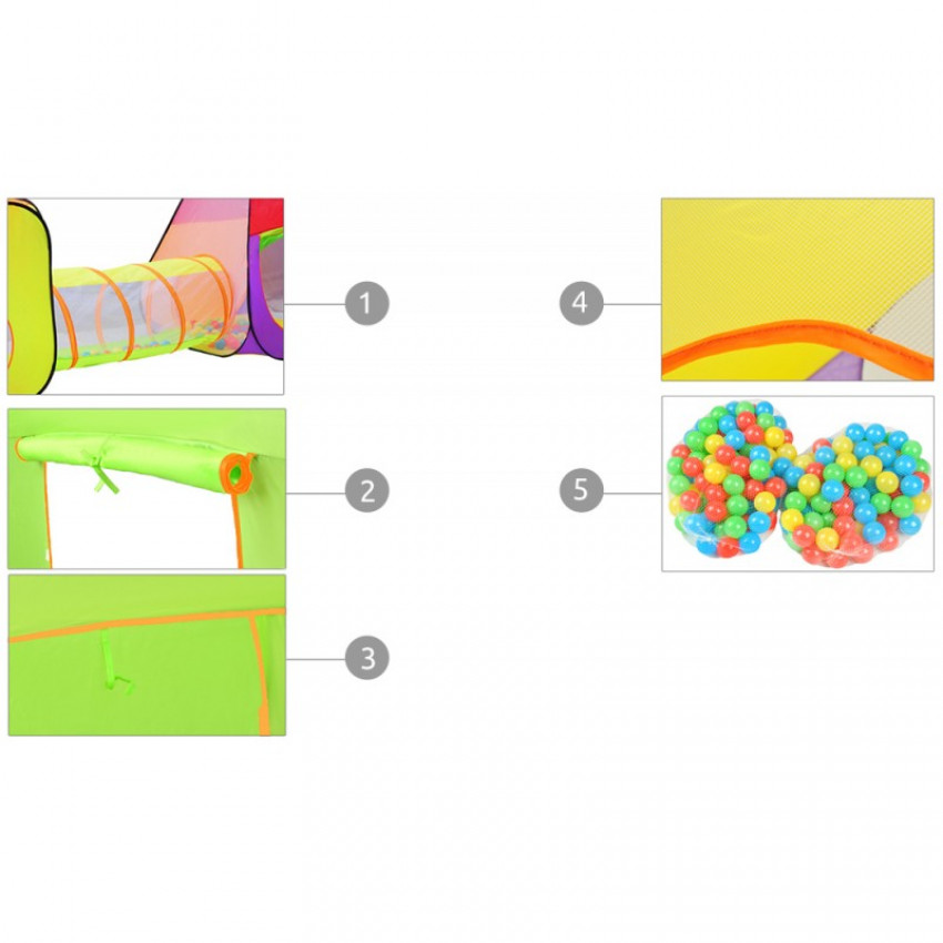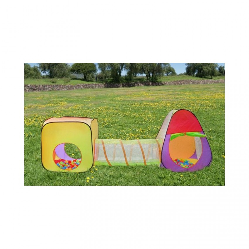 Tento veľký detský stan s 200 loptičkami a plaziacím tunelom poskytne Vašim deťom skvelú zábavu. Trojdielny detský stan môžete postaviť doma aj vonku. S jednotlivými dielmi je tiež možné hrať sa samostatne. Diely sú uložené v praktickom obale a možno ich kdekoľvek niekoľkými jednoduchými pohybmi zložiť. Otvory zaisťujú dobrú cirkuláciu vzduchu a vďaka priehľadnému povrchu budete mať svoje ratolesti pri hre vždy pod dohľadom.