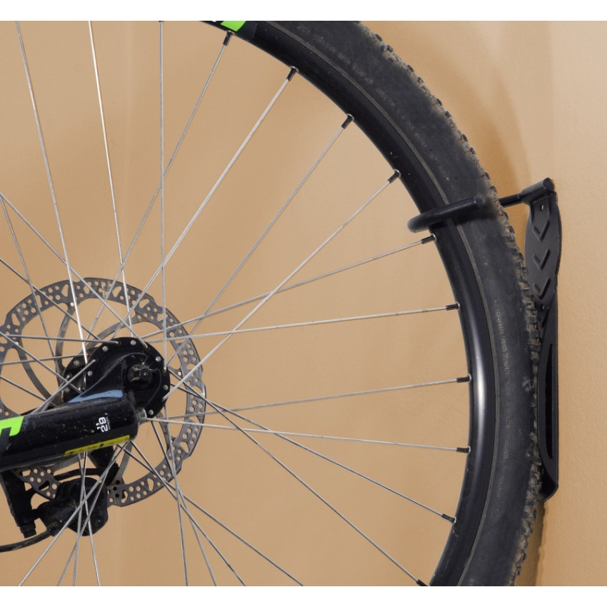 Efektívny spôsob ako ušetriť miesto v byte pre váš bicykel. S držiakom na stenu ľahko zavesíte bicykel za predné koleso a ušetríte tak drahocenný priestor. Vodiaca doska so zábranou zaisťuje koleso proti pohybu do strán. Montáž je jednoduchá a rýchla - vykonáva sa pripevnením pomocou 4 skrutiek s hmoždinkami, ktoré sú samozrejme súčasťou balenia. Konštrukcia je celokovová, hák pogumovaný a nosnosť držiaku je 25 kg. Vhodné pre všetky typy bicyklov.