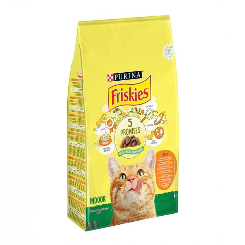 Granule pre mačky Friskies Cat Indoor obsahujú vlákninu pre zdravé trávenie a proti tvorbe chumáčov (klkov) v tráviacom trakte, zelenú trávu s obsahom proteínov a čakanky, ktoré obmedzujú zápach pri vyprázdňovaní. Granule sú ideálne pre dospelé mačky všetkých plemien. Kompletné krmivo pre mačky Friskies Cat Indoor je vyrobené z kvalitných surovín. Individuálne potreby mačiek sa môžu líšiť, preto je potrebné kŕmnu dávku prispôsobiť tak, aby si vaša mačka udržala optimálnu telesnú hmotnosť. Čerstvá pitná voda by mala byť neustále k dispozícii. Dostatočný príjem vody je nevyhnutnou súčasťou zdravej každodennej výživy.