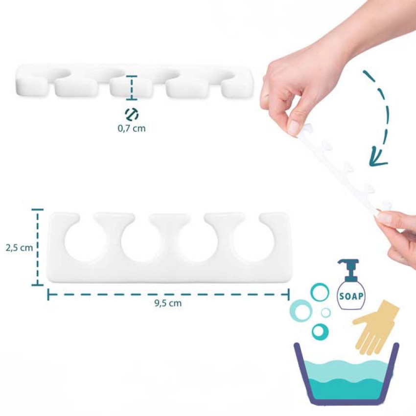 Oddeľovače prstov možno prať ručne v teplej mydlovej vode bez stráty funkčných vlastností.
