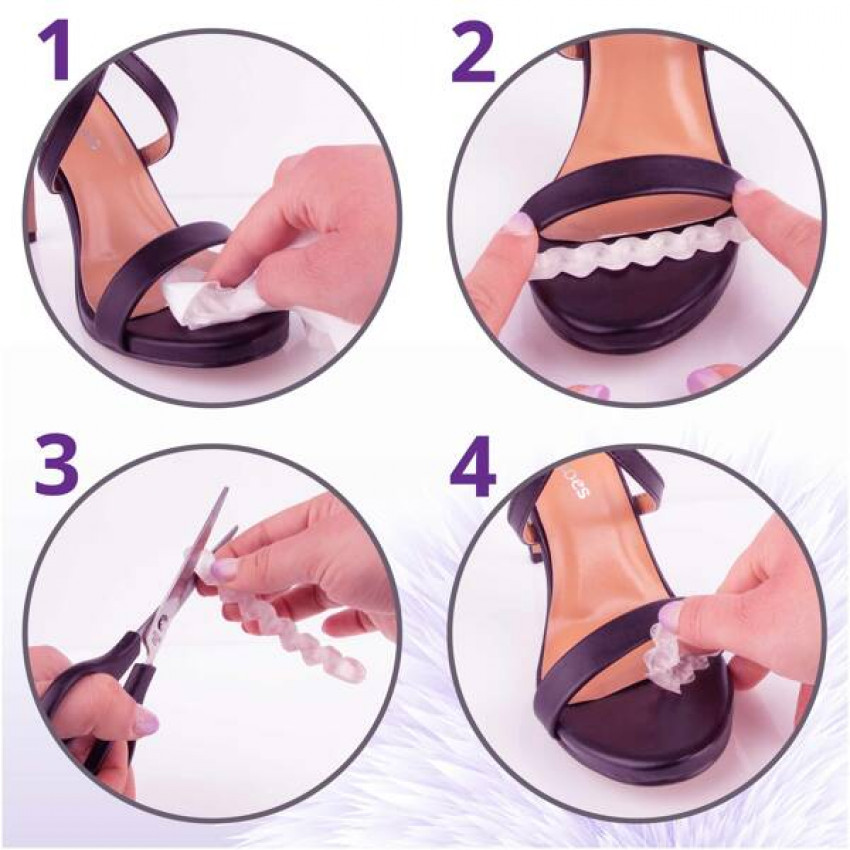 Spodná strana vložiek je pokrytá lepidlom, stačí odtrhnúť ochrannú fóliu a umiestniť ju do prednej časti topánky na miesto, kde prsty vychádzajú z chodidla. Nalepenie vložiek v tomto mieste na podrážke zaistí, že chodidlo sa o tieto mäkké vložky opiera a nebude sa šmýkať ďalej ku špičke topánky.
