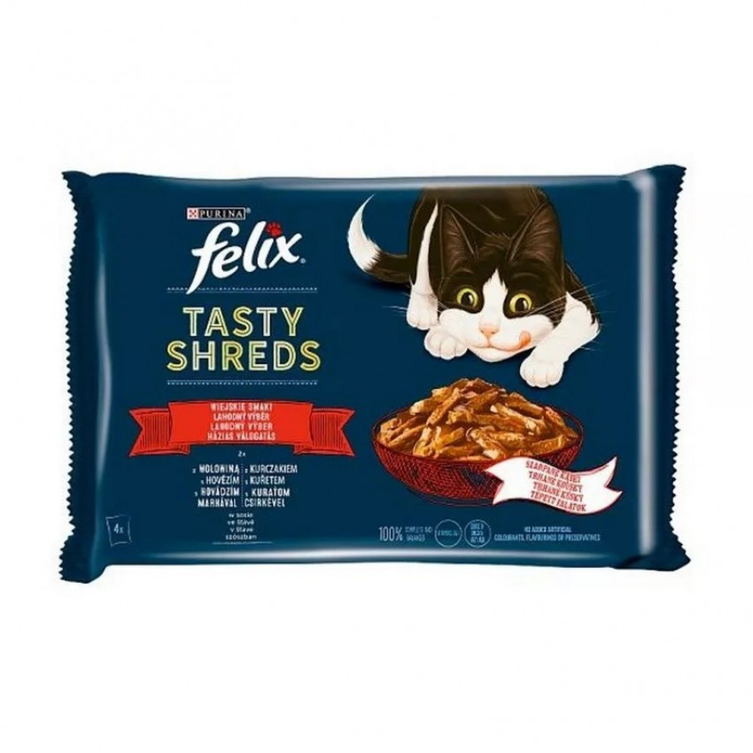 Kapsičky pre dospelé mačky Felix s delikátnym mäsom v šťave - kura, hovädzie, vo forme trhaných kúskov. Ak chcete svoju mačku rozmaznávať mimoriadne chutným krmivom, tak je Felix Tasty Shreds skvelou voľbou. Jemné „kúsky“ mäsa sú doplnené jemnou omáčkou – maškrtníci na štyroch labkách len ťažko odolajú. Vďaka svojmu vyváženému zloženiu vhodné pre každodennú stravu dospelých mačiek - podávajte buď samostatne alebo v kombinácii so suchým krmivom. Umožňuje ako zdroj cenných živín a životne dôležitých látok vrátane omega mastných kyselín a vitamínov.