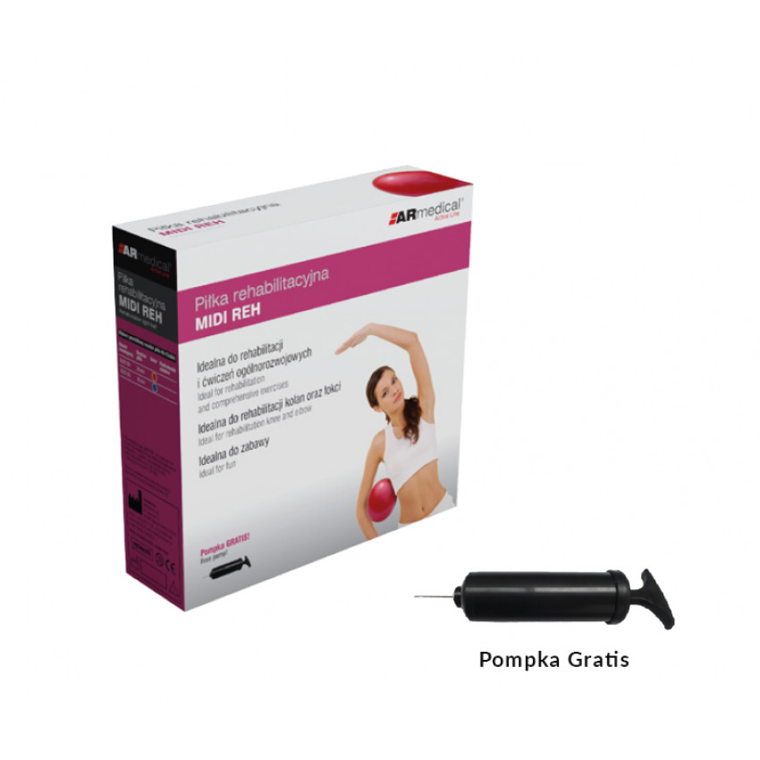 Rehabilitačná lopta MIDI REH je určená na terapiu na zlepšenie fyzického stavu a koordinácie pohybov, na izometrické cvičenia, ktoré pôsobia proti svalovej atrofii, na udržanie svalovej aktivity imobilizovaných častí tela (pri úrazoch a zlomeninách) a na obnovu svalov, rast a silu.