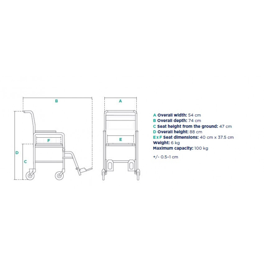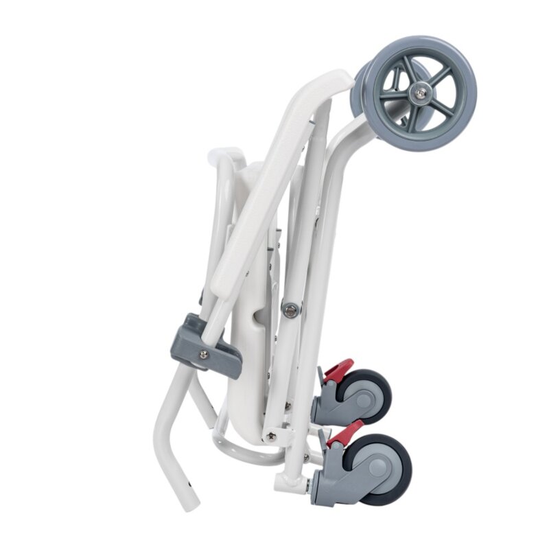 Táto pojazdná sprchová stolička bola navrhnutá pre jednoduchý presun osoby priamo do sprchy bez nutnosti zdvíhania alebo presúvania z invalidného vozíka. Je určená na použitie výlučne so sprievodnou osobou a výhradne v interiéri – v domácnosti, domove dôchodcov alebo nemocnici.