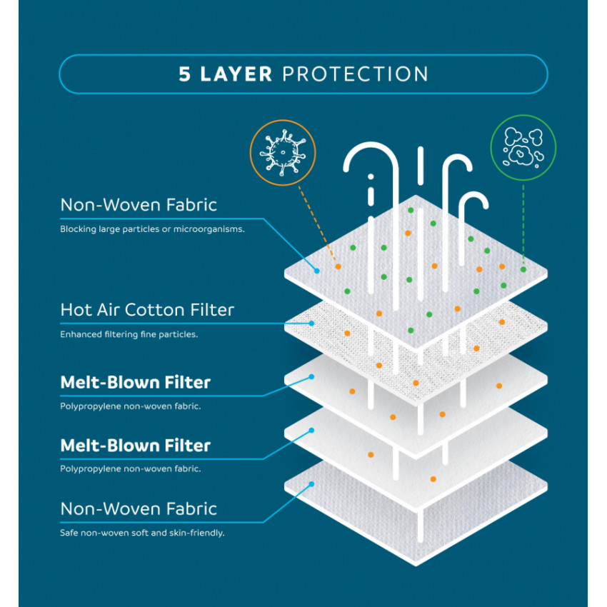 Poskytuje účinnú ochranu proti Covid-19 a iným časticiam vďaka filtračnej úrovni FFP2. Zachytáva až 95% častíc o veľkosti 0,3 mikrometra, vrátane aerosólov, prachových a smogových častíc, či peľu.