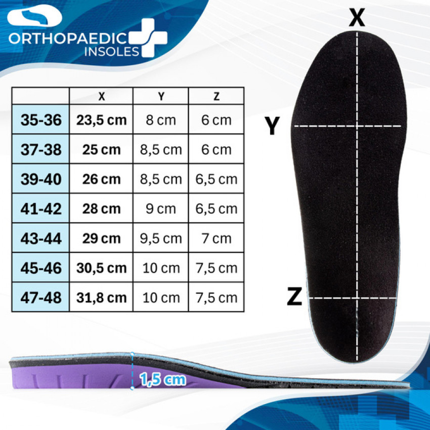 Vložky sú k dispozícii v rôznych veľkostiach, aby sa zabezpečilo dokonalé prispôsobenie. Pred výberom veľkosti odporúčame zmerať aktuálne vložky do topánok a porovnať ich s tabuľkou veľkostí nižšie: