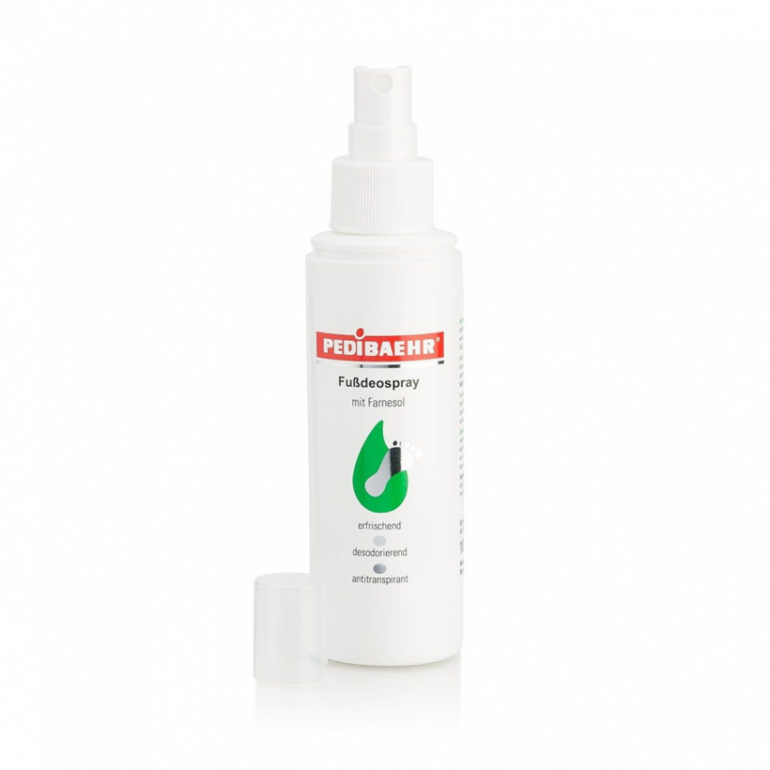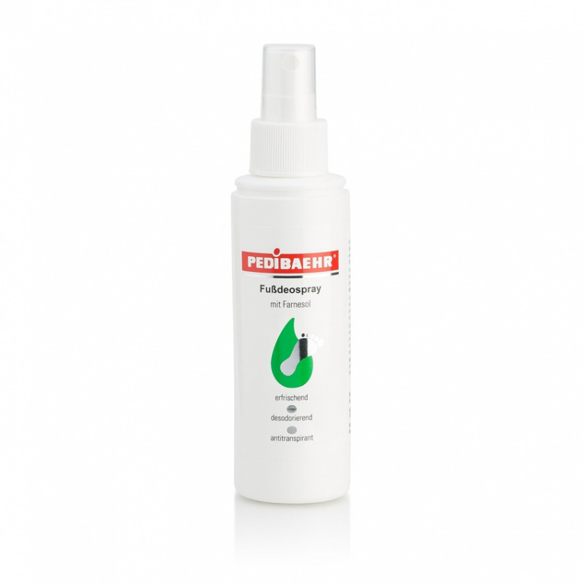 Osviežujúci sprej na nohy PEDIBAEHR s prírodnou deodoračnou zložkou farnesol chladí a spoľahlivo potláča zápach nôh s dlhodobým efektom. Obsahuje tiež glycerín, alumínium a chlórhydrát. Farnesol prináša úľavu spoteným nohám a naviac má protizápalové účinky. Vytvára priaznivé prostredie na povrchu pokožky a má ochranný účinok proti mykózam. Sprej obsahuje allantoín a glycerín, ktorý hydratuje, regeneruje a chráni pokožku. Po aplikácií nezanecháva pocit mastnoty.
