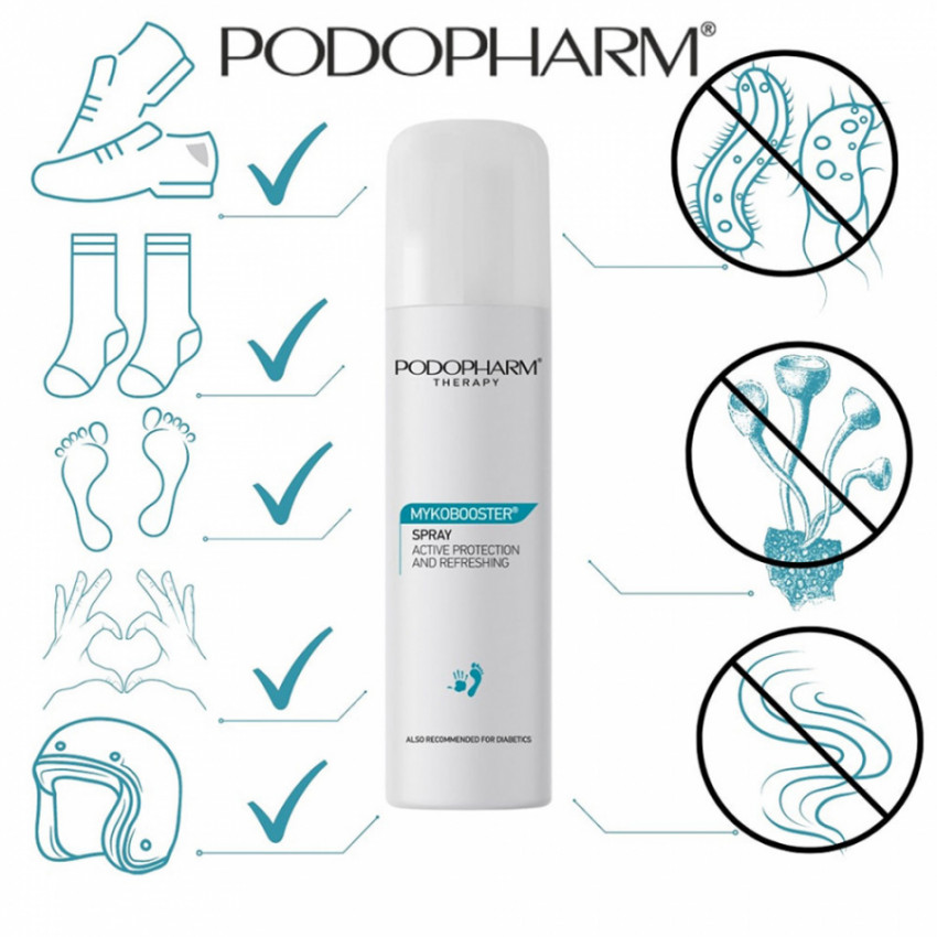 PODOPHARM MYKOBOOSTER SPREJ je vysoko účinný sprej určený na ošetrenie a ochranu nechtov a pokožky rúk a nôh pred plesňovými infekciami. Jeho zloženie obsahuje patentované komplexy aXophenone® a aXonnite Silver®, ktoré účinne ničia vírusy, plesne a baktérie, čím zabezpečujú dlhodobú antimikrobiálnu ochranu.