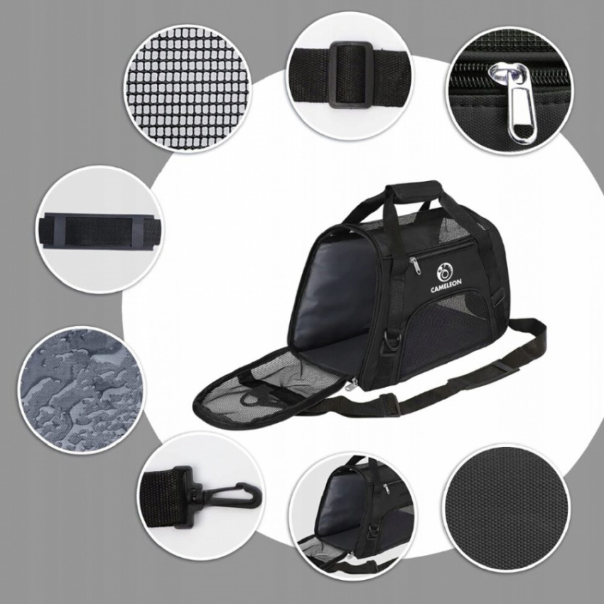 Taška na prepravu zvieratiek je vyrobená z odolných materiálov, takže odolá záťaži až 10 kg. Nylonový materiál, z ktorého sú vyrobené steny tašky, je vodeodolný, sieťovina, z ktorej sú vyrobené bočné chlopne, je odolná a neroztrhne sa ani nerozhryzie. Pohodlné bočné otvory umožnia zvieraťu voľný vstup a výstup z tašky a ďalšie vrecko na zips v hornej časti vám umožní uložiť drobnosti, ako sú maškrty, zdravotná knižka alebo pas.