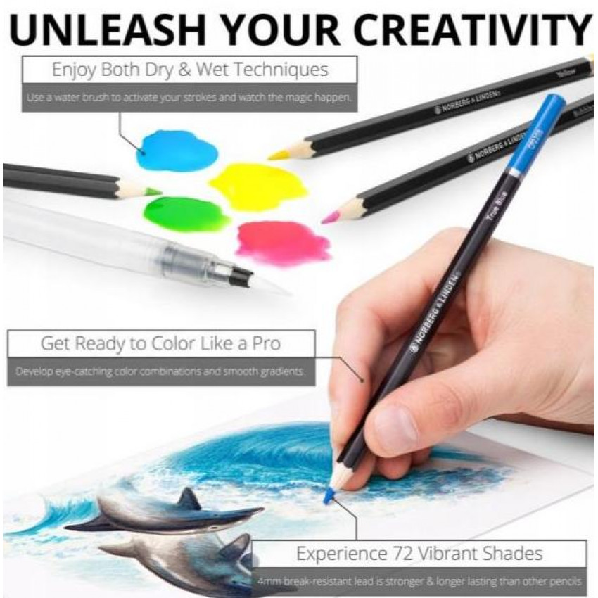 Profesionálna sada na kreslenie pre nováčikov alebo skúsených profesionálov. Začnite kresliť hneď, ako otvoríte balík. Sada obsahuje 72 kusov profesionálnych farebných akvarelových ceruziek presne a vopred nabrúsených s protišmykovou úpravou. Sada s 32 stranovým blokom akvarelového profesionálného 300g papiera papierom, pripravená na akciu.