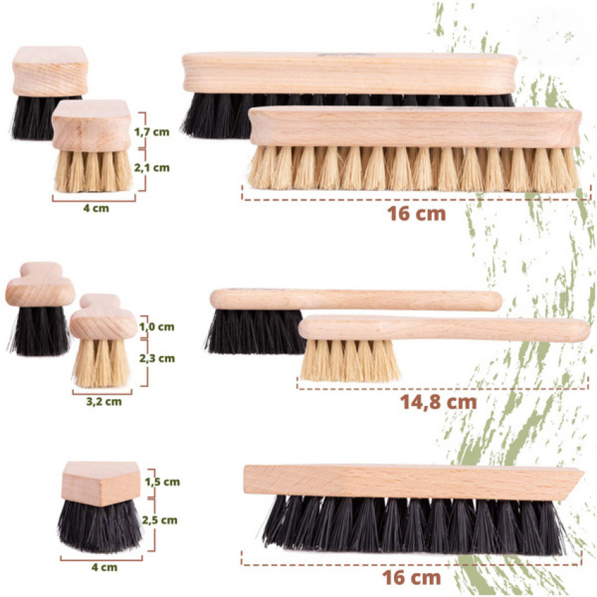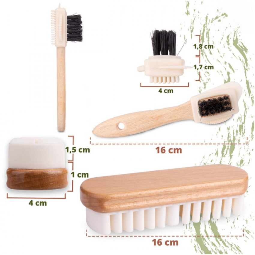 Sada obsahuje rôzne typy kefiek, pastové fixky, krém na topánky na vodnej báze, jemnú bavlnenú utierku a malý kovový obuvák.