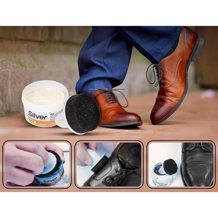 Predstavujeme vám SILVER samoleštiaci krém na obuv s aplikátorom, ktorý je ideálnym riešením pre každého, kto chce svoje topánky udržať v perfektnom stave bez námahy. Tento špeciálny krém je navrhnutý tak, aby okamžite dodal vašej obuvi krásny, lesklý vzhľad, pričom zároveň chráni a predlžuje jej životnosť.