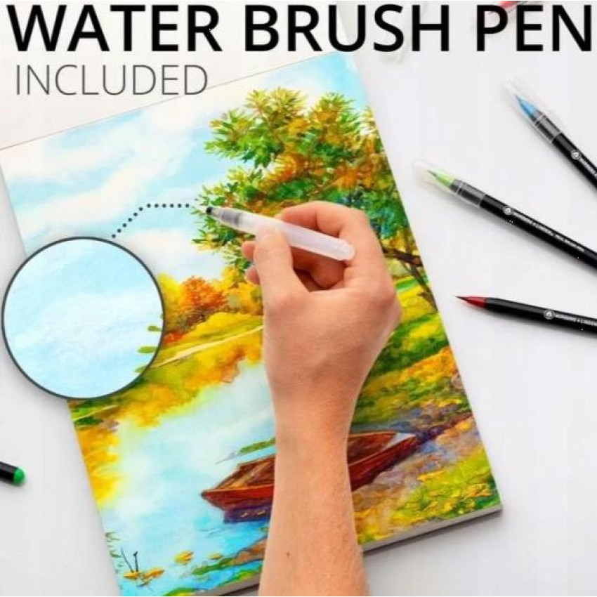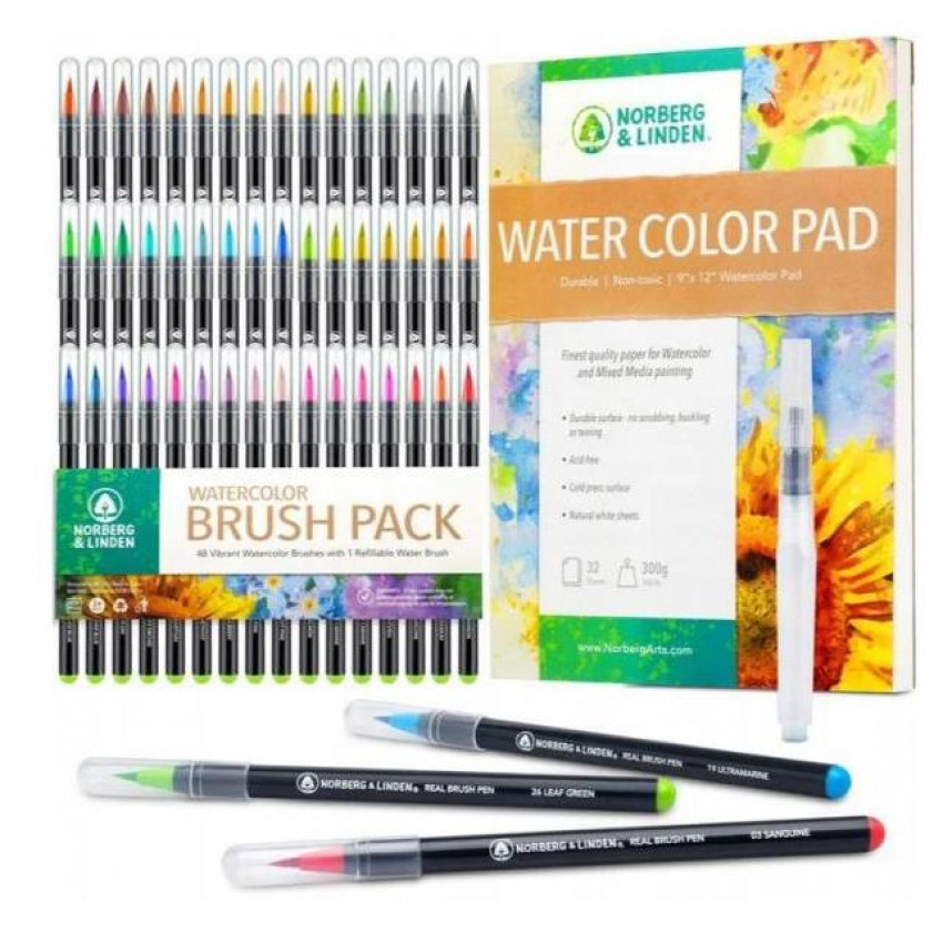 S touto sadou môžete začať kresliť hneď, ako ju otvoríte. Obsahuje 48 kusov profesionálnych farebných akvarelových fixiek s flexibilným hrotom, vodou plniaci štetec a 32 stranový blok profesionálneho akvarelového 300g papiera, pripravený na akciu.