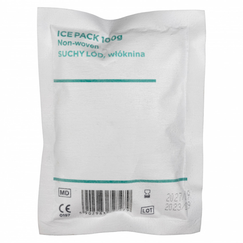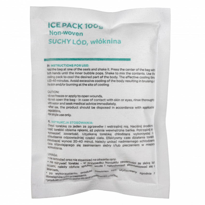Netkaná textília suchý ľad - 100 g slúži na zníženie bolesti a opuchov spôsobených úrazom, vykĺbením kĺbov alebo pomliaždením svalov. Malé rozmery obalu a nízka hmotnosť umožňujú uložiť obklad takmer do každého vrecka batohu bez výraznej záťaže.