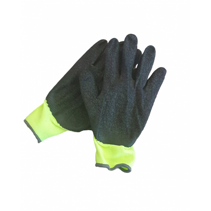 Rukavice sú v neónovej a čiernej farbe, čo zvyšuje ich viditeľnosť pri práci.